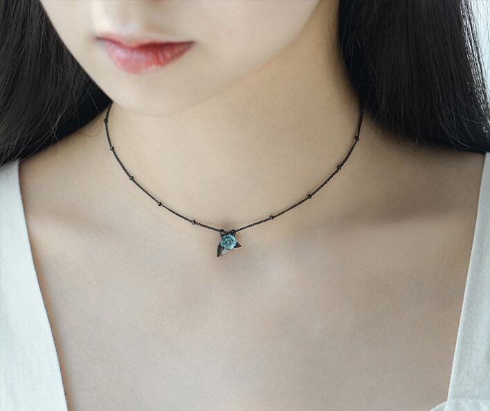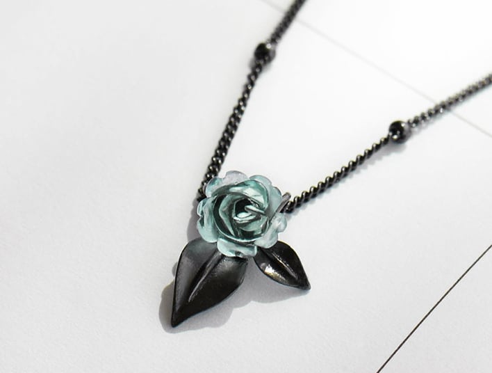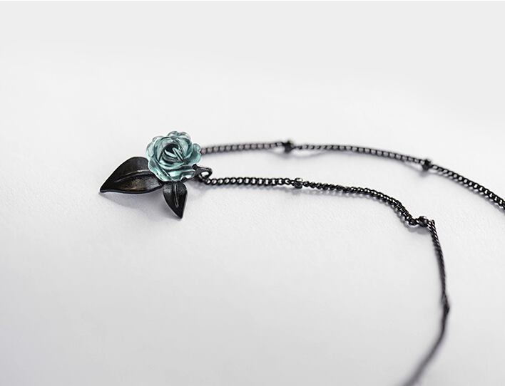 ブラックベースのチェーンに、小さなブルーローズがちょこんと咲いています。